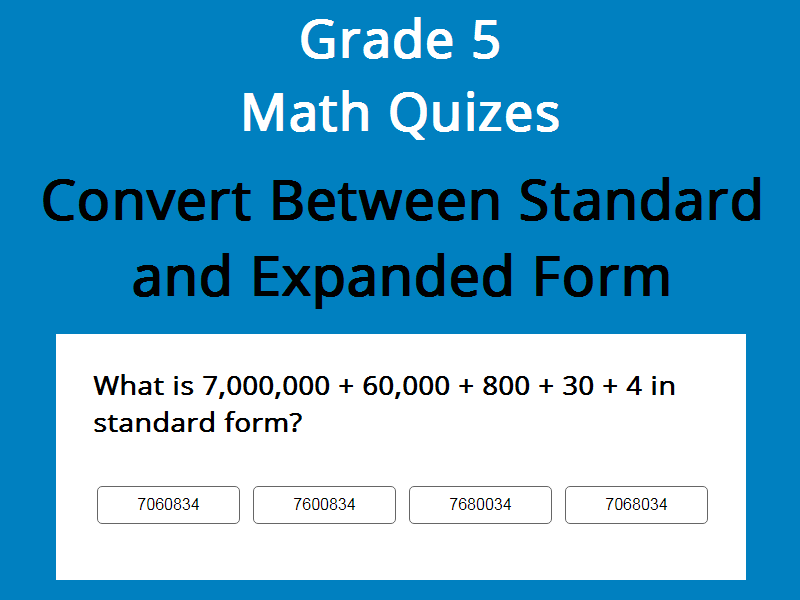 Quiz for converting numbers from expanded notation (place value) into standard numeric notation.