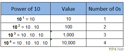 When 10 is raised to a whole number exponent, its value has a leftmost digit of 1 and all other digits are 0. The exponent tells you how many 0s come after the 1.